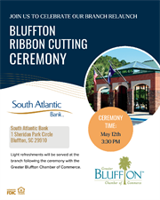 South Atlantic Bank wants to invite you to come join us for our Ribbon Cutting Event to Relaunch our Bluffton Branch. May 12th at 3:30 pm.